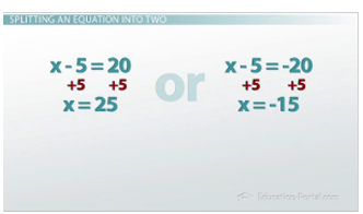 After you split it up into two equations, then you can substitute back in what's on the inside of the bars by taking your finger away and saying, 'oh yeah, there's an x-5 there.' So x-5 = 20 or x-5 = -20, and those are the correct two equations we should end up with.