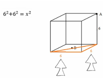 6^2 + 6^2 = x^2, so x^2 = 72. That makes x equal to 6(sqrt2). B is right in the middle of the bottom face, so we'll cut this in half to find the distance just from the corner to B: it's 3(sqrt2). Now see what we have? A right triangle with two known sides.